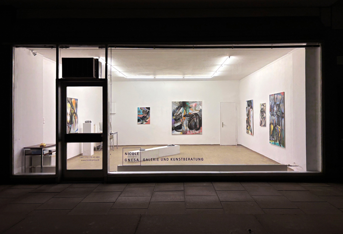 FUZZY CHIMERA Opening reception for the artists: March 12, 2026, 6 pm Exhibition: March 13 - May 2, 2026 Please scroll down for the English version Maurice Merleau-Ponty Formen, Oberflächen und Strukturen ordnen sich scheinbar mühelos ein. Erst im nächsten Moment offenbart sich, dass diese Ordnung brüchig ist. Fuzzy Chimera zeigt neue Arbeiten von Alfredo Barsuglia und Vincent Kern. Ausgangspunkt ist das Gesehene, in dem Vertrautheit und Täuschung zusammenfallen. Alfredo Barsuglias neue Skulpturen wirken aus der Distanz wie amorphe Klumpen. Die Objekte erscheinen metallisch, schwer und fremd, beinahe extraterrestrisch. Bei näherem Hinsehen erweisen sie sich als Brotlaibe. Assoziationen von Einfachheit, Demut und Grundversorgung stellen sich ein. Brot wird als grundlegende Voraussetzung des Lebens lesbar. Die ausgestellten Brotlaibe sind kein Abgüsse in Aluminium, es sind echte Brote, die getrocknet und lackiert wurden, es sind Unikate. Die Wahrnehmung greift vor und fixiert ein Material, das sich im Sehen als Projektion erweist. Nicht das Objekt täuscht, sondern das Bild im Kopf. Mit diesem Moment der Enttäuschung löst sich jede Form von Sozialromantik auf. Das Brot ist weder Monument noch Geste der Bescheidenheit, sondern verfremdet, seiner Funktion als Nahrung enthoben und der Logik des Konsums entzogen. Als Objekt verschiebt sich seine Bedeutung vom Gebrauch zur Zuschreibung. Sichtbar wird nicht der Abguss eines Multiples, sondern eine Erscheinung, die im Vollzug der Wahrnehmung entsteht. Und erst am Ende wird das Material konkret: Handgeknetetes Roggenbrot, ein Stoff mit langer kultureller Geschichte, der in Barsuglias Arbeiten semantisch wie ontologisch radikal verschoben wird. Vincent Kerns neue Arbeiten entfalten einen malerischen Bildraum aus leuchtenden, pastelligen Farben und tiefschwarzen Schlieren. Die Tusche bildet kraftvolle Strukturen, die sich wie Bahnen oder Systeme über die Bildfläche legen. Figürlichkeit scheint auf und entzieht sich zugleich. Körper erscheinen fragmentarisch, Formen bleiben ohne eindeutige Zuordnung. Die Bilder bewegen sich zwischen Zartheit und Kraft. Poetisch helle Farbflächen stehen neben energischen, beinahe technoiden Setzungen. Die Strukturen erinnern an Maschinen, Rohre oder technische Umläufe, zugleich aber auch an digitale Bildlogiken und visuelle Spuren künstlicher Intelligenz. Malerei wird hier zum Ort einer Schwebe zwischen Menschlichem und Technischem, zwischen Geste und System. Technik erscheint nicht als Motiv, sondern als ordnendes Prinzip des Bildes. Die Arbeiten folgen keiner stabilen Logik und kommen nicht zur Ruhe. Überlagerungen, Übermalungen und Korrekturen bleiben sichtbar. Abstraktion ist angestrebt, wird jedoch nie vollständig eingelöst. Das Figürliche kehrt als Rest zurück und hält den Bildraum offen. Verfahren und Bildidee bleiben sichtbar verschränkt. In dieser kontrollierten Anlage öffnet sich ein Raum für das Metaphysische. Kerns Bilder suchen nicht nach Darstellung, sondern nach Annäherung an das, was sich vollständiger Lesbarkeit entzieht. Das Kosmische fungiert dabei weniger als Motiv denn als Konstrukt für Distanz, Unendlichkeit und das Unverfügbare. In beiden Positionen öffnet sich also ein Bezug zum Weltraum. Wärend bei Kern wird dieser explizit wird, etwa in Titeln wie Jupiterbahn, die auf Umlauf, Distanz und Ordnungssysteme verweisen, ohne sie festzuschreiben, bleibt bei Barsuglia das Kosmische implizit. Die Skulpturen wirken auch aufgrund ihrer metallischen Oberfläche fremd, als kämen sie aus einem anderen Zusammenhang, losgelöst von Herkunft und Funktion. Der Weltraum erscheint hier nicht als Ort, sondern als Denkfigur für Entzug, Maßstabslosigkeit und eine Wahrnehmung jenseits des Alltäglichen. In den Arbeiten beider Künstler wird Wahrnehmung nicht als Mittel verstanden, um die Welt abzubilden, sondern als Ort, an dem sie überhaupt erst erscheint. Das Sichtbare verweist dabei immer auf etwas, dessen Bedeutung sich entzieht. Wahrnehmung selbst wird zum Gegenstand, nicht um Gewissheit zu erzeugen, sondern um jene Dimension sichtbar zu machen, in der das Erscheinende mehr ist als das, was gezeigt wird. Die Chimäre bleibt unscharf, nicht aus Mangel, sondern als Haltung. // Forms, surfaces and structures seem to settle effortlessly into place. Only in the next moment does it become apparent that this order is fragile. Fuzzy Chimera presents new works by Alfredo Barsuglia and Vincent Kern. The point of departure is the seen, where familiarity and deception converge. Alfredo Barsuglia's new sculptures appear from a distance like shapeless lumps. The objects seem metallic, heavy and alien, almost extraterrestrial. On closer inspection, the forms reveal themselves to be loaves of bread. Associations of simplicity, humility and basic sustenance arise. Bread becomes legible as a fundamental precondition of life. The loaves on display are not casts in aluminum; they are real breads, dried and lacquered, unique pieces. Perception anticipates and fixes upon a material that proves, in the act of seeing, to be projection. It is not the object that deceives, but the image in the mind. With this moment of disillusionment, any trace of social romanticism dissolves. The bread is neither monument nor gesture of modesty, but estranged, removed from its function as food and withdrawn from the logic of consumption. As an object, its meaning shifts from use to attribution. What becomes visible is not the cast of a multiple, but an apparition that emerges in the act of perception. Only at the end does the material become concrete: hand-kneaded rye bread, a substance with a long cultural history that, in Barsuglia's work, is radically displaced both semantically and ontologically. Vincent Kern's new works unfold a painterly pictorial space of luminous pastel colors and deep black streaks. The ink forms powerful structures that spread across the surface like trajectories or systems. Figuration fli